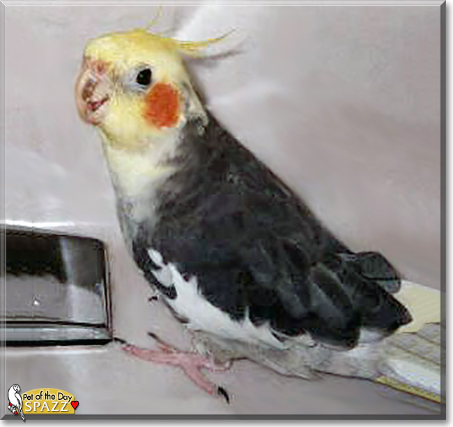 Dearest Spazzy, what an absolutely gorgeous Cockatiel you are! Your coloring is stunning, and what a sweet face you have with those lovely dark eyes and the orange cheek patch and that cute beak that looks like you are smiling (and you probably are!). You have the most delightful personality, and you make your dear family members smile with your antics. What a nice story of how you came to be part of your forever family! Clearly that was a match meant to be, wasn't it. You and your dear special friend and all your family members love each other very much, don't you. What a wonderful love-filled home you share!