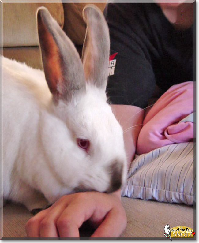 Dearest Snotz, what an adorable Giant California Rabbit you are! Your white fur is so pretty and looks so soft, and you have the sweetest face with that cute brown nose and those lovely big eyes. You're very smart, and you know which rooms you're not allowed in. You're curious and nosy and at times comical. You're full of energy and make your dear Mom smile with your antics. You love to cuddle on Mom's lap and watch TV. You love attention and affection, and you get a lot of both. You and Mom love each other very much, don't you. She loves you so much she even cooks bunny treats for you! What a delightful love-filled home you share.