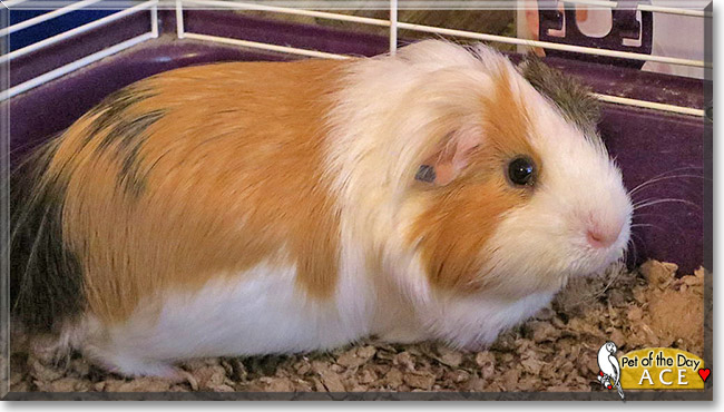 Dearest Ace, what an adorable Guinea Pig you are, with that colorful, pretty fur that looks so soft and that sweet face with the cute pink nose and lovely dark eyes! Thank you for sharing those great photos with us. What a sweet picture of you being held in your dear friend's hands! You've got a lot of spunk and energy, and you start squeaking when you hear anything that reminds you of food. You'll grab a piece of fruit or vegetable and run with it into your house! You've bonded with your dear person's dad, and you've become a kind of bloodhound, watching for him and squeaking when he comes out of his room or to the apartment door. As your person says, you're "a loveable bundle of fur and an appreciated member of the family." You and they all love each other very much, don't you. What a wonderful love-filled home you share!