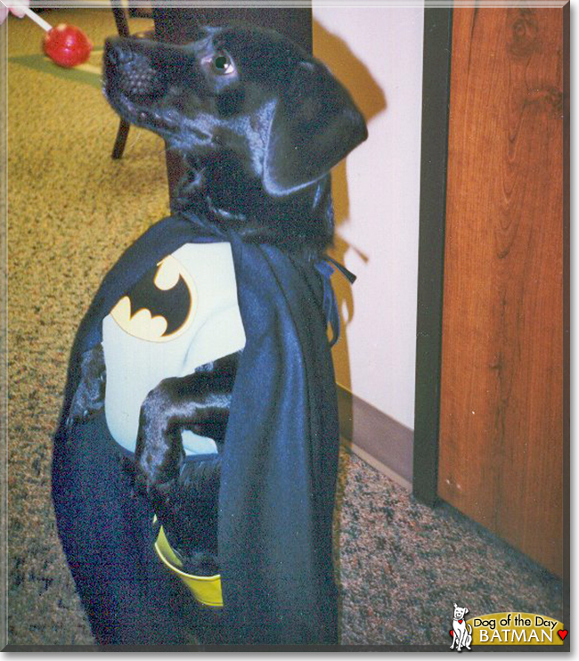 Dearest Batman, what an adorable Caped Crusader you are! You're so cute, with your big Black Lab head and little Dachshund body, and you're only about one foot tall. You're full of energy and quite fast. You love to go to the park and chase tennis balls. You also enjoy playing "dress up" and having your picture taken. You and your dear person love each other very much, don't you. What a wonderful love-filled home you share!