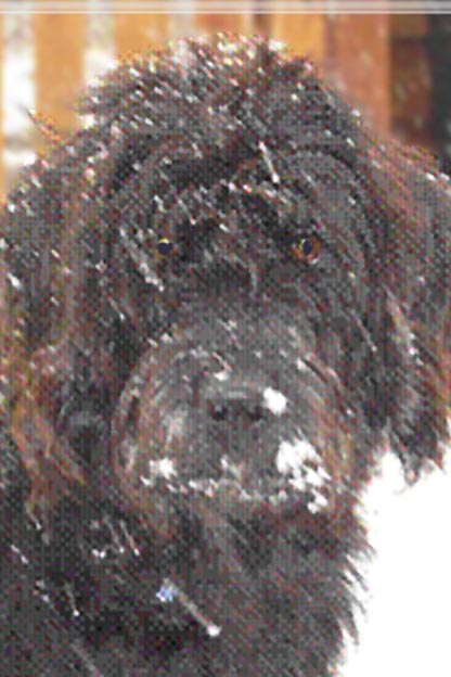 Dearest Marlo, what a gorgeous Labradoodle you are! You are very handsome indeed, out there in the snow with flakes on your thick brown and black coat. You have the sweetest face with lovely brown eyes! You live in Saxony, Germany, you're eight and a half years old, and you love to run and jump. You love a juicy bone, but you'll eat just about anything, even your dear person's birthday cake one time! You often seem to be sleeping on your blanket, but you're a totally playful pup. You're your person's dear friend, because you're very friendly and won't bite your people. You both love each other very much, don't you. What a wonderful love-filled home you share!