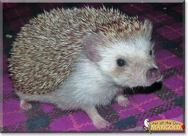 Dearest Marigold, what a sweet little adorable Hedgehog you are! You are so cute with that bristly brown and white coat, those little legs and feet, and that sweet face with the cute nose and lovely big dark eyes. And what a delightful personality you have! You're full of energy, and you make your dear person smile with your antics, such as floating on your back in the bathtub or exploring new things outside. He/she says you have quite the attitude. You love your sleep time, and you love looking at and chasing your reflection in the mirror. Your favorite food is cat food, and your favorite game is playing with your dog toys. You make her/him very happy, and you make me happy learning about you, too! You two love each other very much, don't you. What a wonderful love-filled home you share!