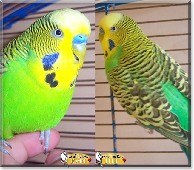Dearest John and Jill, what beautiful Budgerigars you are! You have gorgeous, colorful feathers and sweet faces with lovely big dark eyes. You both look as though you're smiling (and maybe you are!). You are perfect pets for your dear young friend because your schedules match. You get to fly around and play after your friend finishes his/her homework. You go back into your cage when she/he calls you. And you all go to bed at the same time. You sing a very lovely song to him/her each morning when the sun breaks through. Jill, you have a fine vocabulary: "mum", "banana," and "John." John, you'll learn to answer back! You all love each other very much, don't you. What a wonderful love-filled home you share!