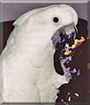 Dearest Snuggles, aren't you ever adorable! What a gorgeous Umbrella Cockatoo you are, with those bright white feathers and that sweet face with the lovely dark eyes and the big smile as you eat that pizza slice! You have a delightful personality, too, so lovable, cuddling up on the couch with your dear person every afternoon and taking a nap. You and your two other bird housemates are your person's CHILDREN, so that makes you birds all siblings, I guess. You yell "outside" when you want to visit your squirrel friends (or more siblings, since your person also considers them his/her children). You love to throw nuts for them, and I bet they love to get them. You let them know who's boss if they get too close to your person. You and she/he love each other very much, don't you. What a wonderful love-filled home you share!