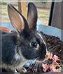 Dearest Fusion, what a beautiful child you are, a precious baby bunny indeed! You were just born in May, so you're going on three months old now! Your black and white coat is gorgeous and looks so very soft, and what a sweet face you have with those long white whiskers and those lovely big eyes that are half blue, half brown. You and your four siblings were surprise babies. You love to play with your brother Dusty and hop around and eat carrots, mint, and strawberries. You want to be a model when you grow up. I'm already looking forward to seeing you on magazine covers. Perhaps you will be the next Playboy Bunny!