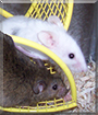Dearest Fani and Miss Whiskers, what an adorable pair of Fancy Mice you are! You're both so cute, with your soft-looking, colorful coats and your sweet faces with the lovely big dark eyes. You were originally mice for a school science fair project. Once the science fair was over, your dear young friend kept you both, since mice like to have cage mates. You're lots of fun for him/her to watch! You have two wheels, but you usually both go on the same one, one in one direction and the other in the opposite, so you don't go anywhere! Your friend has learned a lot from you, including responsibility, to be gentle and patient, and what the meaning of limber is. You all love each other very much, don't you. What a wonderful love-filled home you share!