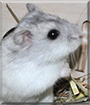 Dearest Molly, you are adorable! What a precious Dwarf Hamster you are, indeed. You are so cute with the soft grey and white coat and the sweet face with the cute pink nose and lovely dark eyes. You are unusual in some ways! You don't like toys made for hamsters, and your favorite toy is one made for budgies. You don't like vegetables, either. You prefer the store-bought hamster food. You and your dear person love each other very much, don't you (even if you occasionally bite when you have a bad day). What a wonderful love-filled home you share!