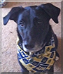 Dearest Sidney, what a handsome Labrador Retriever mix boy you are! You are stunning indeed, with that coal-black fur and the white toes on your left front and back paws. What a sweet face you have, with those lovely big dark eyes, and aren't you gorgeous in your bandana from your trip to the groomer! You have the most delightful personality, too. You're a good, dear boy, patient with your beagle/terrier mix younger sister. You were wild as a puppy, but you've matured into a handsome, sweet, calm boy now seven years old. You still enjoy long walks and have energy to spare after! You and your dear sister and people all love each other very much, don't you. What a wonderful love-filled home you share!