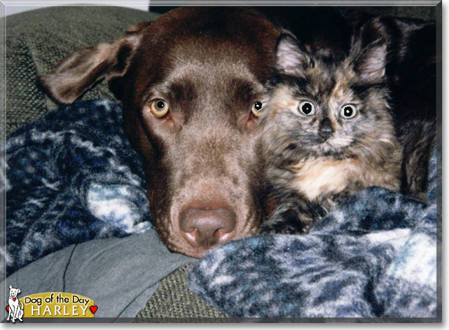 Dearest Harley, what a handsome Chocolate Lab you are, with that silky brown-black fur that glistens in the light and looks so very soft, and that sweet face with those soft floppy ears and the lovely big golden-brown eyes gazing at me. And what a delightful personality you have! You're so sweet with your teddy, and how adorable you and your little new kitten friend and protege Keebler are, cuddling up together. You love the water, any water, and you love to retrieve anything thrown for you to get. You're friendly to all and get along well with other dogs and cats. Your family has your mom dog, so they've known you since before you were born! You all love each other very much, don't you. What a wonderful love-filled home you share!