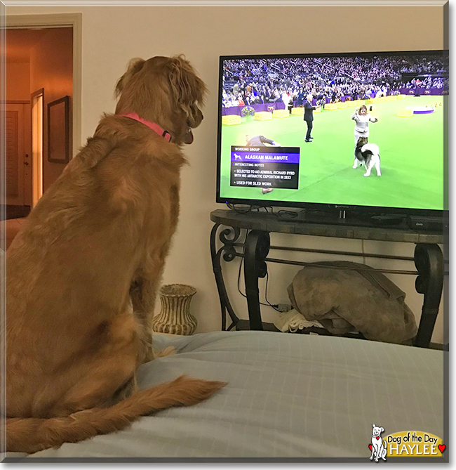 Omigosh! Dearest Haylee, you are absolutely stunning! You are such a beautiful Golden Retriever, with that gold-orange-brown coat that looks so soft and that sweet face with those lovely big dark eyes and what looks like a big smile there (and probably is!). Thank you for sharing those fantastic photos with us! They show so many different views of your beauty and sides of your delightful personality. You love everybody, including strangers, and you enjoy watching TV, especially shows featuring dogs! You're very relaxed all day, and your energy picks up at about bedtime for your dear people. You and they all love each other very much, don't you. What a wonderful love-filled home you share!