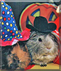 Dearest Gimlet and Boomie, you are utterly adorable! What a delightful pair of Abyssinian Guinea Pigs you are, all dressed up for Halloween. You're both so pretty, with those furry colorful sweet faces poking out from your costumes. You love playing dress-up, and you chat up a storm. That's so nice the way that you, Gimlet, the older one, welcomed young Boomie when he came along. After a day or so, you became best friends! You both love each other and your dear persons very much, don't you. What a wonderful love-filled home you share!