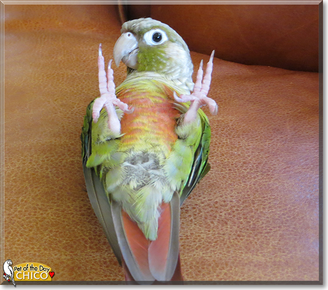 Dearest Chico, you are absolutely adorable! What a beautiful, sweet Green Cheek Conure you are. Thank you for sharing those great photos with us! They show so well your gorgeous appearance with those colorful feathers and that sweet face with those lovely big dark eyes and that pale beak with what looks like a big smile (and probably is!). You're so cute lying on your back there with your legs reaching up!
