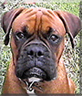 Dearest Dusty, you are gorgeous indeed! What a sweet beauty of a boxer you are. With just one look into those puppy loving eyes, I certainly can't resist! And you aren't just another pretty face.. You have the most delightful personality, too! You're very friendly and loving. You love playing ball with the kids and swimming in the pond and chasing the frogs around it, even looking for them in winter when they're busy hibernating! You're a very happy dog, a joy to be around, and the pride of all who see you. I'd love to watch you do your Boxer "kidney bean" dance! You and your dear people all love each other very much, don't you. What a wonderful love-filled home you share!