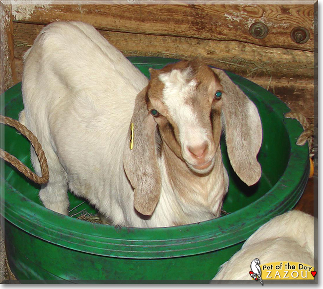 Congratulations, darling Zazou, on being chosen Pet of the Day! We hope you and your dear people and goats and all your family and friends are enjoying a fine celebration, full of fun and lovies and all your favorite games and treats.
