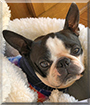 Dearest Ken's Warrior Princess, A.K.A. Xena, you are precious! What a delightful Boston Terrier you are, absolutely adorable in those great photos, and thank you for sharing them with us. You're so cute, dressed up in your colorful fleece jacket (after all, it's still winter!) and then posing among your pillow collection. Those close-ups of your face as you're snuggled up resting are gorgeous! You have the most delightful personality, too. As your dear person says, you're "a beautiful gentle lady inside and out." That comes through so well in those photos! You joined your family after the passing of their two dear loving and beloved elderly Boston Terriers last year. You all love each other very much, don't you. What a wonderful love-filled home you share!