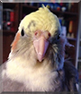 Dearest Luca, what a beautiful, precious Lutino Pied Cockatiel you are indeed, just five months old! Those feathers are absolutely stunning in their color and variety and design, and don't you just have the sweetest face with those bright orange cheeks and the lovely dark eyes and that mouth with what looks like a great big smile (and probably is!). Thank you for sharing those great photos with us. And what a terrific story you have to tell, of what a vital role you play in your family! You joined the family at age eight weeks, to be a feathery companion and help control your dear person's anxiety levels. Right away you became attached to each other, and you've been the best of friends ever since! Your person has become much calmer, and the anxiety doesn't spike too high. You love each other very much, don't you. What a wonderful love-filled home you share!