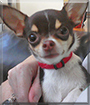 Dearest Noelle, what an utterly adorable Chihuahua you are! You're absolutely gorgeous in all these great photos, and thank you for sharing them with us. Your fur is so pretty, and you have the sweetest face with those huge ears and lovely big dark eyes. And what a delightful personality you have! As your dear person says, you're 'a "people person" in dog form.' You love to be with people, touching them at all times, even sleeping with them in their beds. You also love to be held and to meet new people, though you get skittish with large groups of people you don't know. You enjoy playing tug of war, and you like to bring your favorite toy to someone as a signal for playing. You even know how to "walk tall," walking a few steps on your hind legs! You and all your family members love each other very much, don't you. What a wonderful love-filled home you share!