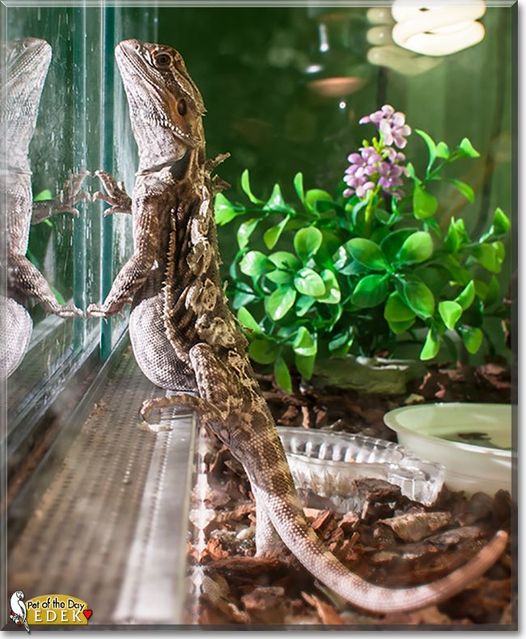 Dearest Edek, you are stunning indeed! What a breathtakingly beautiful Agama Lizard you are! You're so pretty, standing there in that window with the sun shining in so brightly. And you have such a delightful personality, too. Your dear person finds you fascinating to watch! You're an insectivore, so you eat mealworms and dried crickets, and any live bugs that make their way into your habitat! You and your person love each other very much, don't you. What a wonderful love-filled home you share!
