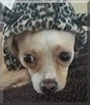 Oh my goodness, dearest Snoopy, you are adorable beyond words! You're such a cute Chihuahua, curled up on that blanket wearing your nice leopard-spotted fleece hat (which you didn't really appreciate, but you put up with it for the photo). Your light brown fur is so pretty and looks so soft, and you have the sweetest face with those lovely big dark eyes. And what a delightful personality you have! You're full of energy and make your dear person smile with your antics. You love to play and to run around, and you know several good tricks. And you're very intelligent and you listen to commands! You're such a good boy, and you and your person love each other very much, don't you. What a wonderful love-filled home you share!