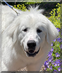 Now that is one proud Daddy talking, and understandably so! What pawrent wouldn't be singing the praises of a pup, a furry family member as gorgeous, as sweet and loving, as special as you, Bentley; the ultimate gentle giant! You truly are one beautiful blend of Pyreneese and Colorado Moutain Dog, Bentley, posing so proudly beside those pretty, purple floofs! Your fluffy, snow white coat is so pretty, your soulful brown eyes total heart-melters! And just look at that sparkling white, toofie smile!:D I think I'm in love!