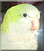 Dearest Jake, what a beautiful young Quaker Parrot you are! Thank you for sharing that terrific photo with us. Those green and white feathers are gorgeous, and what a sweet face you have with those lovely big eyes and that pale-orange beak that looks like it might be smiling.. and it probably is, since the picture was taken right after you had a bath! You love getting wet, so much so that your people say you must have some duck in your family tree. You make them smile with your antics and energy. You're a fun little bird who does not think of himself as small at all! You live with them and dog Bugsy and cat Charlie. You all get along, but your people wisely never leave you outside your cage without supervision. You all love each other very much, don't you. What a wonderful love-filled home you share!