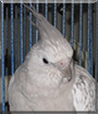 Dearest Firestorm, you are absolutely stunning! What a beautiful whiteface pearl Cockatiel you are, a big girl of eight months of age! And what a delightful personality you have! You're full of mischief and will steal food from Archie the conure, if you're in the mood. You live peacefully with your roommates Redshift, Mindwipe, and Archie, and you're learning how to eat from the aviary's bird feeder. I'm so sorry you recently lost your mate. It's good you have Archie and the others annoying you as you look for a replacement! You're shy of hands and don't care to be handled, but you're very lovable. You love to sit on the swinging perch at the back of the aviary. You and your dear person and roommates all love each other very much, don't you. What a wonderful love-filled home you share!
