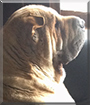 Dearest Tiny, what an utterly gorgeous fellow you are! You're absolutely precious, perched up in that chair. Your wrinkly fur is so pretty and looks so soft, and you have the sweetest face, looking off out the window there. And those tiny feet are adorable! You have the most delightful personality, too! You think you're a human, and you chat with people in various whines and noises. You alert your dear people if a visitor arrives. Shar Pei dogs need special care to keep food from getting in your wrinkles, and your people are very good with that. You all love each other very much, don't you. What a wonderful love-filled home you share!