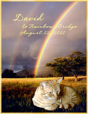 last year when i knew david was going to die soon so i took my camera and maybe took 1000 pix of david and saved them all. when i sing with david, me and diane together sing david cyrus senior fireball special, david cyrus senior fireball special, he's a special orange cat.. over and over and over to him i today after his passing go around the home and then start to sing i love mr david swet mr david special mr david .. and diane does the same.. i may pour a cup of coffee and then sing great mr david song to myself and diane chimes in.. sing along with david is a pastime we do in his honour.. in the last year of his life we kept him inside and he would want out so bad that during his last month we put a harness and leash on him so he wouldnt wonder off and die away fro home. he would go around our fenced yard and enjoy the summer days.. i would take hime out 3-4 time a day everyday so he could do his things and then come back in.. in the last week on august he was getting very feeble so i kept him inside.. his wish was to go outside one last time before he passed awy and we gave him his wish by letting him out on a leash one last time.. one august 12 2011 he owuld eat and he would growl .. he knew him time had come so i took him to the vet one last time where he passed away peacefully to the rainbow bridge. yes when i sing to david i can hear him singing with me.. i shed a tear and go on.. i love you mr david your the worlds greatest kitty that ever lived.. now that you home with the rainbow salmon is queen and buttons is king kitty just like your son that someone stole in 6-2-2002 and when we saw you on the porch that one day chasing a female and wounded we coxed you into the house where we fed you a piece of ham then you went back out and then come in again to be fed a few hours later.. then you decided to stay with us. and we knew that you were the father of the david david that was stolen.. your son who is original david was born with salmon on jusly 19-1999 and when he went missing i never gave up looking for him and and as long as salmon is alive i continue to look for your son. that is why your so special mr david the world greatest orange cat.. thank you for blessing our lives those 8 years you lived with and we will never forget you or your son.. rest in peace dear beautiful david.. thank you for your love. pat n diane........ david cyrus senior fireball special.. your a special orange cat 201205170721