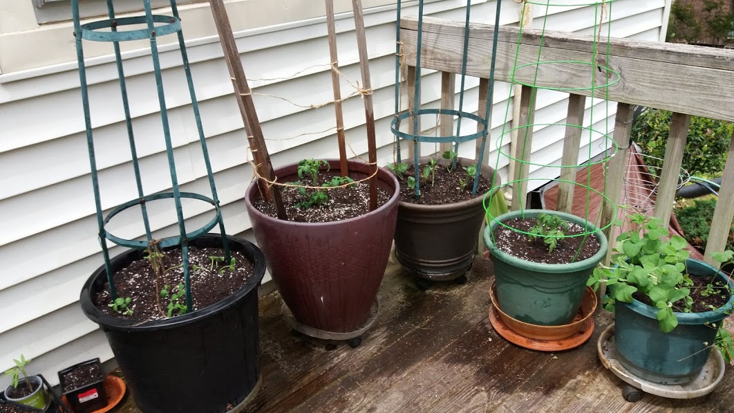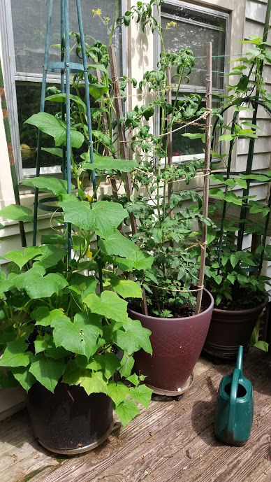 Beans, tomatoes and cucumbers do well with about 6 hours of sun on my deck. Another bonus: No critters to destroy them!