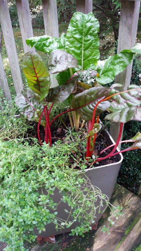 The Swiss chard in the pot, on the other hand, is beautiful, along with some thyme.
