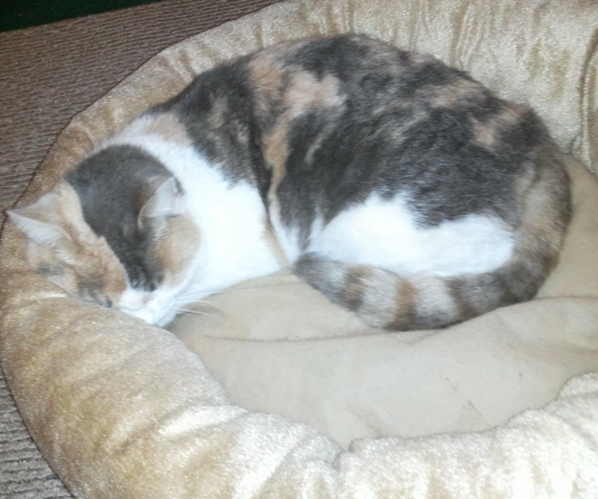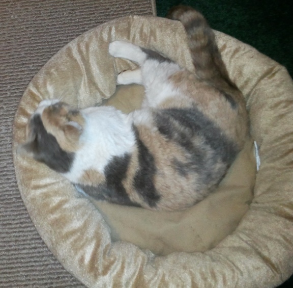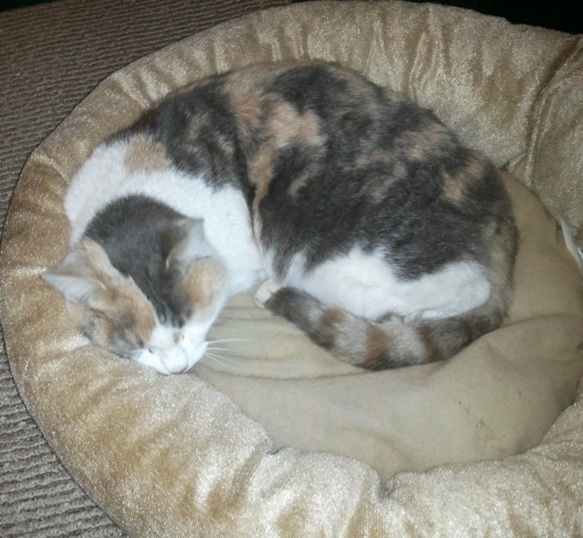 Here she is, in the back bedroom where I kept Bertie/Bella. She seems to be sleeping right now but she is really making biscuits. She probably will sleep a lot now. If I recall, Jane slept for two days after I rescued her.