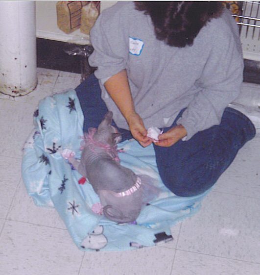 I dressed Cairo up as a ballerina for a Halloween costume contest at Feeder's Supply last weekend. There were 18 entries I believe all dogs and only two cats and the two cats were both Sphynx. Cairo wasn't too happy about it but she looked very cute!! Cuter thatn the three dogs that won the prizes. These are the pictures the store took of her. One of the judeges seemed to really like her and keep trying to get pics of her.