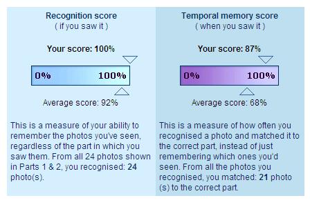 This is a measure of your ability to remember the photos you've seen, regardless of the part in which you saw them. From all 24 photos shown in Parts 1 & 2, you recognised: 47 photo(s). Temporal memory score