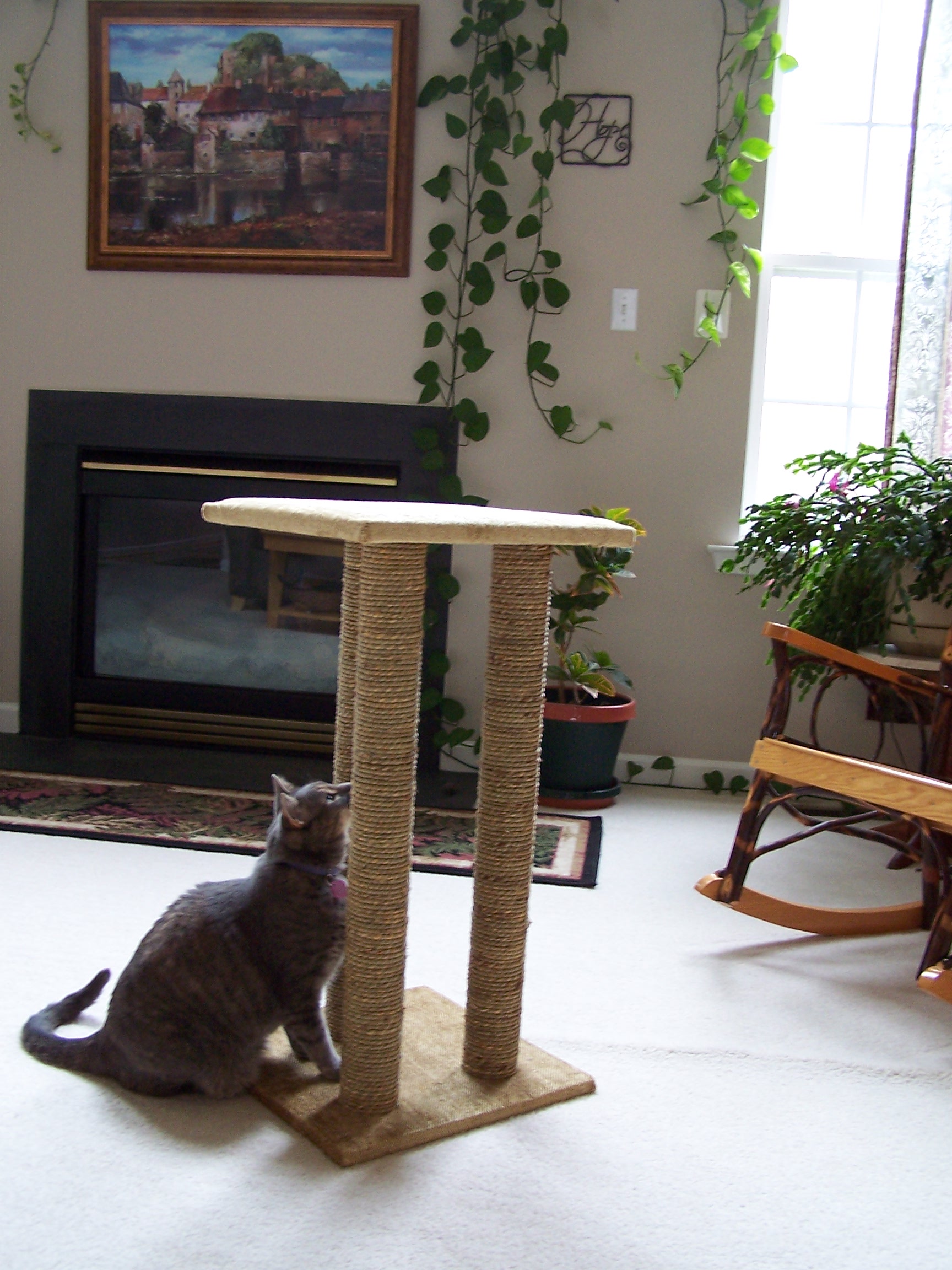 Note from Mom: I stopped for her food, the pet store had this on clearance from $99 to $49, the three towers are kind of a wicker. She loves the wicker chairs in our bedroom, and that floor doesn't have a scratching post, so I had been thinking anyway. One of the workers stopped and I said, it seems a little loose - she showed me where to tighten it, and said, maybe you can get a discount for it. I mentioned it at the checkout - the manager gave me fifty percent off!! I got this for $24.95!! Pinot loved it as soon as it came in the door, I tightened it, it's good as new!! YAY!!:D Happy Gotcha Day, Pinot Girl!!