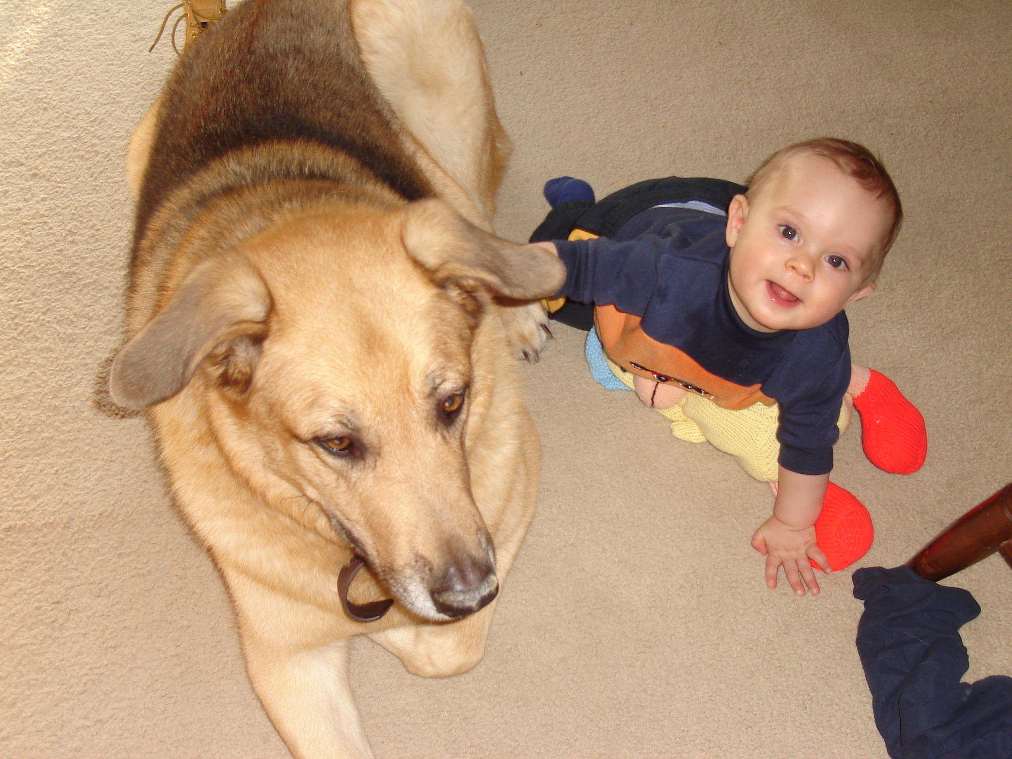 I have a bunch of pictures of Simba with kids, he's a German Shepherd/Pittie.