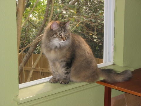 The cat in the window is Merlyn she is 11 years old.....the grey and white cat is Indy...the all black one is Buffy...and the tabby one is Lola