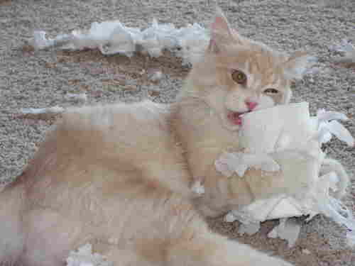 Not too long ago, I had just turned out the light and snuggled under the covers when all of a sudden I hear this very loud SCUFFLESCUFFLESCUFFLE noise coming from the direction of the catboxes, which I had just changed. Thinking it was Shadow, my Russian Blue (RIP Uncle Shadow), who loves to throw huge paws full of litter all over the place, hence the covered boxes...I turned on the light, groaning aloud, "SHA-DOOOOOWWW..." only to find Dandelion, my 3-year-old Flame Point Siamese, with his head poking out of the box. And then his head poked back in, and hilarity ensued as he started chasing his tail inside the litterbox, his sides brushing the sides of the lid so closely that you could see it on the outside, and there was the mystery of the SCUFFLESCUFFLESCUFFLE noise, prominently solved. And of course litter flying out of the box all over the floor. I laughed so hard, that he stopped chasing and poked his head back out, and I saw that familiar sparkle of mischief in those big blue eyes as he poked his head back in and went for another spin around the box a few times!!!