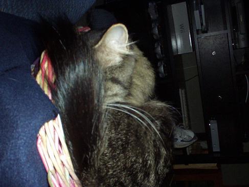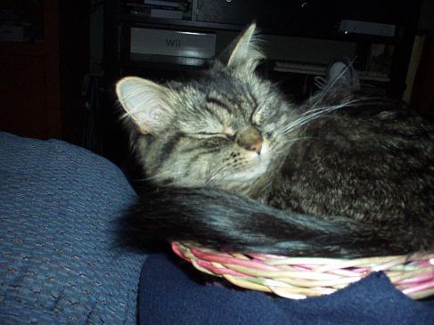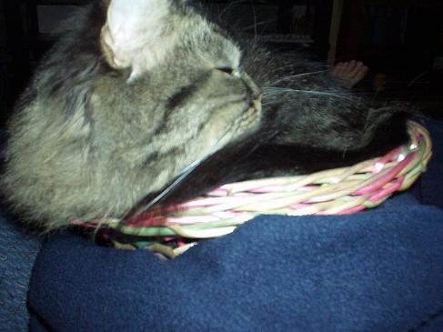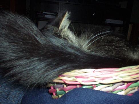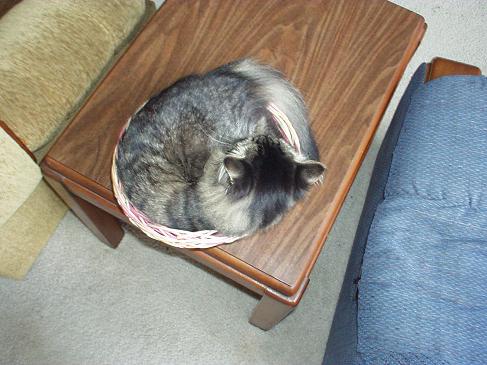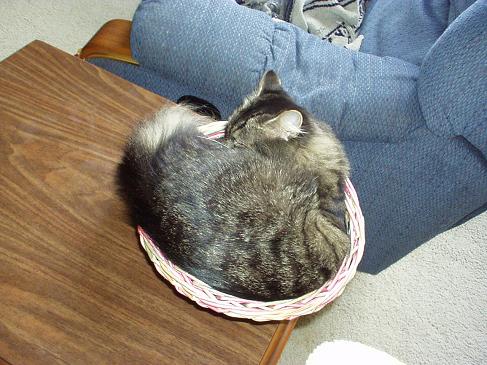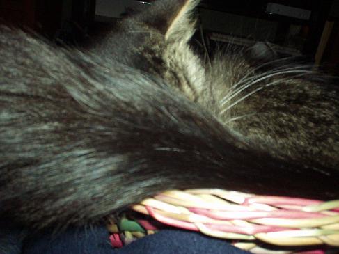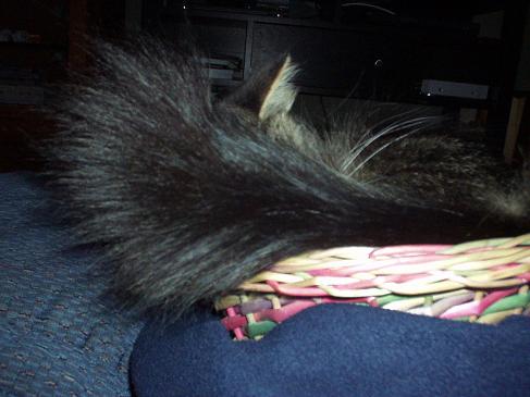 That's quite a tail; how fluffy! Aren't they a riot? My Pidge is my largest cat but she found a bowl that I kept in the center of the table in the patio room and that's where she decided she liked to curl up. Don't bother w/the nice bed I got for ya. That's no good!
