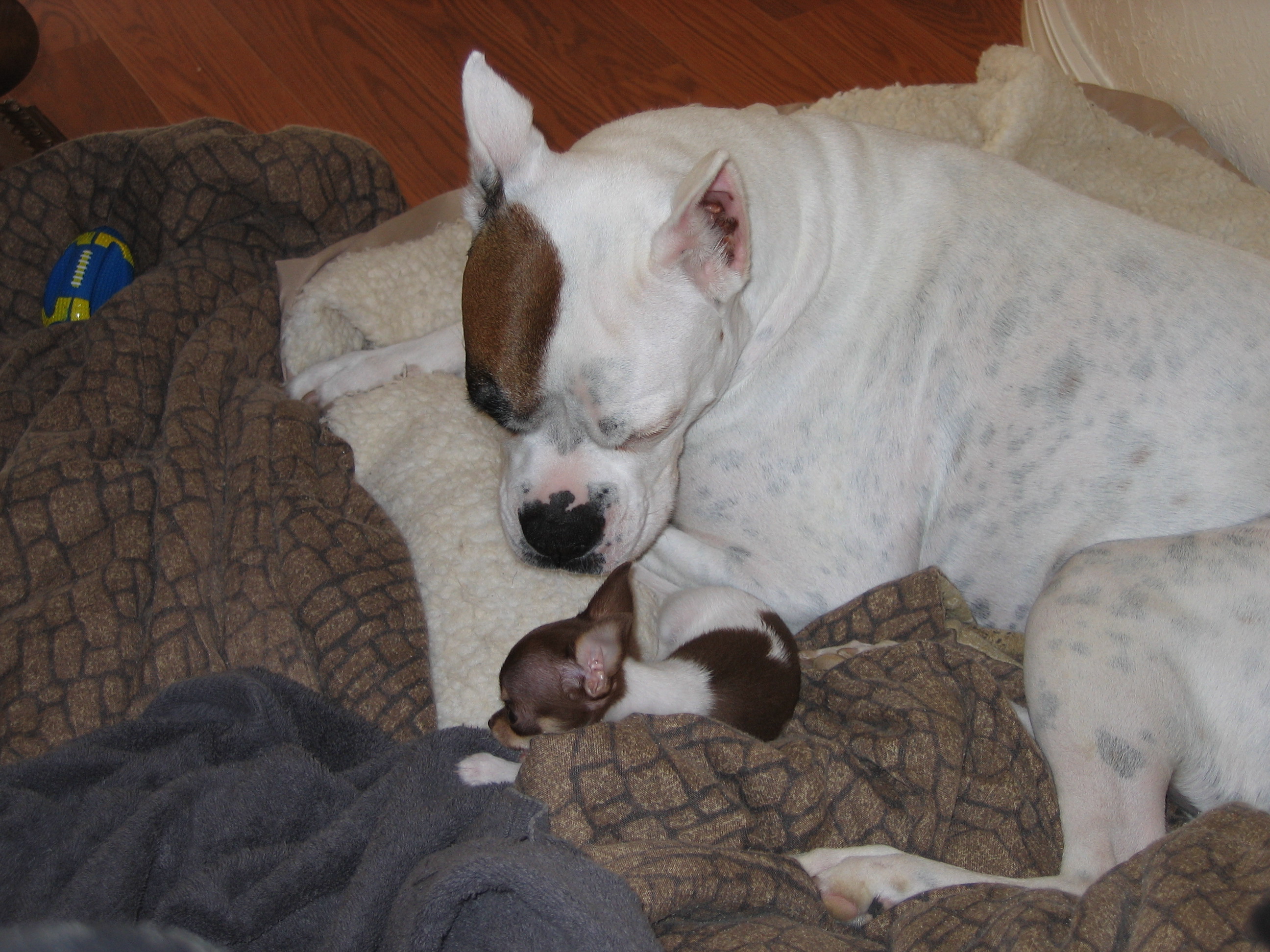 I got a few pics of our new chihuahua puppy, Chopper. He is very hard to take pictures of right yet because he is stuck to me like glueHe loves his Big Brother Duke(white boxer) but Duke is only at the tolerating stage. Duke is not a cuddler with other dogs and that is all the puppy wants to do. I promise to get better ones soon. I had trouble with my camera over the weekend so some I had to delete(it would figure