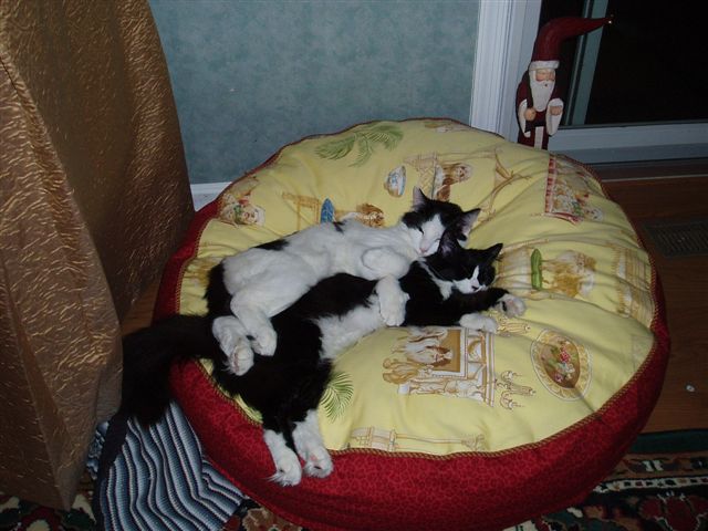 (and there was a foster baby that got adopted into the family, which made it 5 kittens instead of four, and he was Oliver) Next, Ollie was sold to my best friend. We loved Roxy and Shogun so much we kept them. And we we still have them- at 3 years old! Roxy is a FAT girl. Shogun is abnormally skinny. Not a normal bunch of kittens! Heres some pictures of them both. (Roxy is mostly black and Shogun is mostly white. there is also one with Roxy as a baby, and Sasquatch in the corner when he was alive.)
