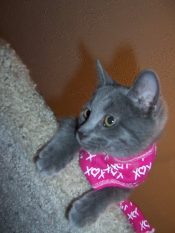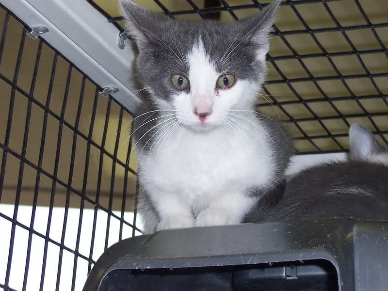 I don't know where to begin with this post, so I will start with how I met Lisa. Back in June I went to Petsupermarket to buy Gracie's dog food and as I walked in the door there was three kittens in the cat condo up for adoption from Shelby County where Lisa/Catcrazylady works. Two of the kittens were gray and white and the other almost all gray with a little white. I of course had to pick them up and hold them because I have wanted a gray and white cat forever and also a solid gray cat( I already even had a name picked out for a boy OR a girl solid gray). This cutie little boy is who my eye caught first because as I said I had wanted one just like this one .
