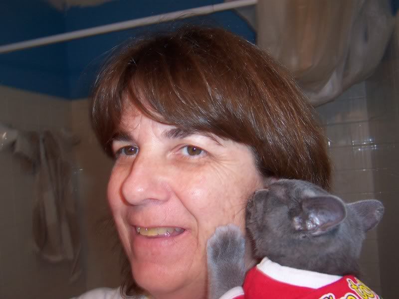 Then I picked up the all gray little girl and the second I picked her up the second I knew I had to have her. She immediately started nursing and kneading on my face and wouldn't stop. Lord knows I didn't need another one nor was I looking for another one since I had a special needs one on the way from NC who was in a high kill shelter. I asked about the adoption process and took an application. The next day I was visiting her again and handed in the application. It was a few days before I actually heard that she was mine and I visited her everyday and everyday she wouldn't stop nursing on my mole on my face.