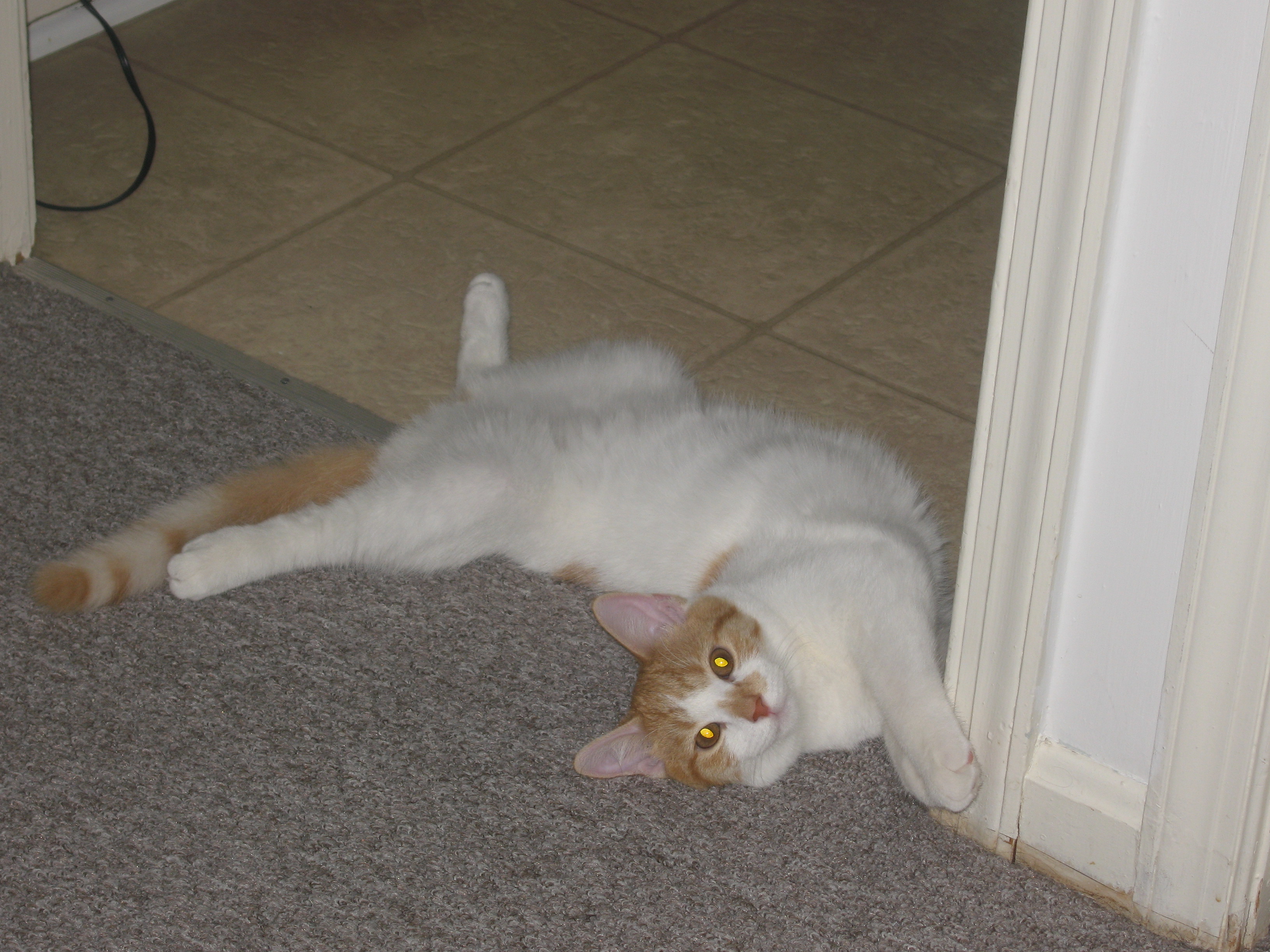 Owen, 1 yr and a few months Orange and white, trapped and tamed of course, was a feral kitten with his family in the woods of my community.