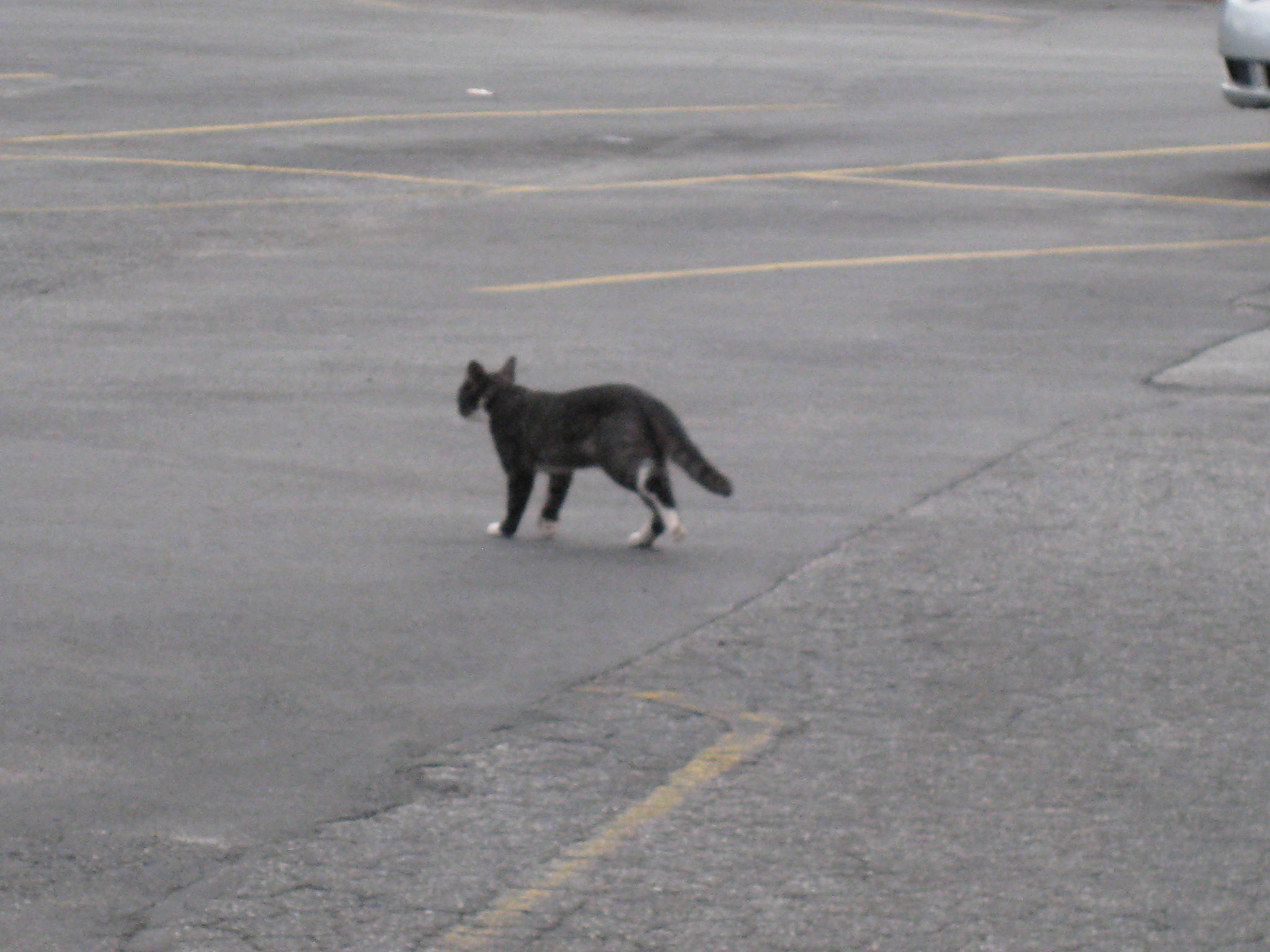 I was feeding one of my colonies tonight and this tuxedo showed up. I have never seen this baby before and was amazed at the markings. The first picture is a face picture, a beautiful Tuxie face, but then I started snapping the rest of the body and check out the tabby markings. Unfortunately the last picture is him cutting thru the parking lot. I was afraid to go after for fear he may head towards the road. I hope he/she will be back.