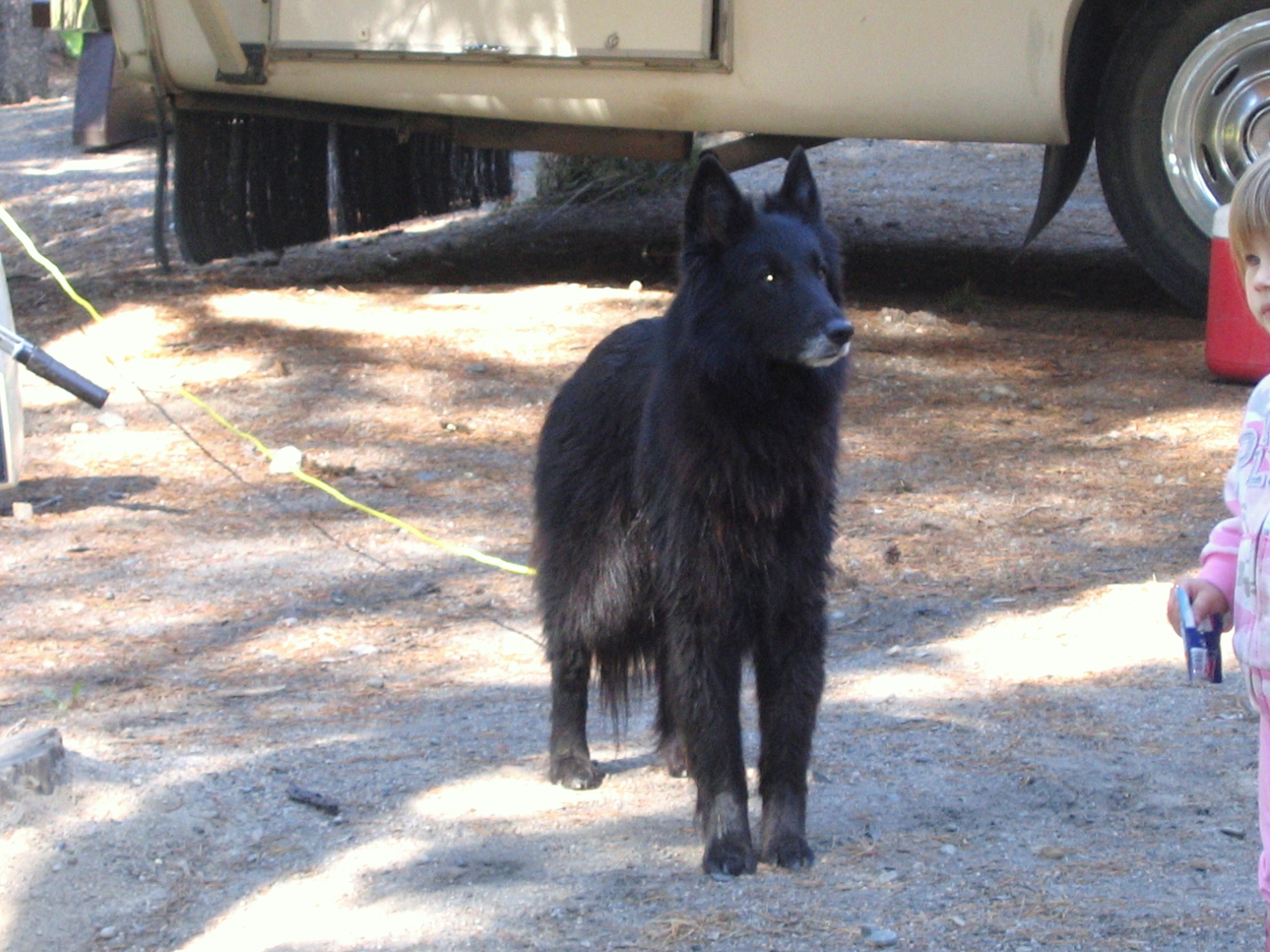 I attached a couple of pictures -- the first is Cory, the male Visa is being bred to, and the rest are all of Visa from a camping trip at Pinnacle Lake, early this summer. When she wasn't tied to the motorhome she spent the entire time running beside the quads or running in circles with a beer can in her mouth (the boys always joke about what a drunk she is -- one minute she's got Pilsner, the next she's got Budweiser, etc -- every few minutes it's a different can! LOL Belgians just need to carry something in their mouths).