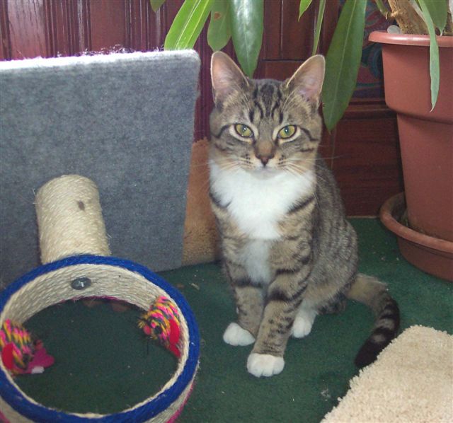 We were born on the streets without a place to call home. One night during an awful storm our feral mom brought us to the safety of a back door of a large Victorian house, where she had always found a full food bowl. While the storm raged with our bellies full, we got tired and curled up with mom in a dry corner by the door. The owner discovered us and took us inside and has let us stay there all of our lives so far {two years}. She had us spayed and neutered and we've had our shots too. We have all the food we can eat and sunny windows to look out and lots of room to play but we don’t get much attention from humans since nobody lives here now but us. Sadly, the house will be rented at the end of this month and we do not have a new home to go to. We would like to stay together since we don’t know much about other humans or the outside world and we’re pretty wary of strangers. We will need someone patient, willing to wait until we can trust them and get comfortable in our new place. Our current foster mom has been good to us and loves us but now needs someone to take over responsibilities for us and help us find permanent homes.