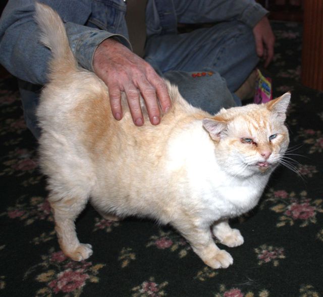 I've been on the streets for so long that I can't even recall when I ever had a home. I'm not even sure of my age; I think maybe 5 or years old. I've lost my tail and a few teeth and I've got a lot of battle scars to show for all the street fights that I've been in, hence my name Narley, except that I spell it w/out the G. I really am pretty gnarley looking but life is tough on the streets for feral tom cats. At one point I was so sick w/an upper respiratory infection and a very bad case of ear mites. I was cold, hungry and just plain worn out and I was ready to give up. Luck was w/me one day, though, because I wandered up to an old house that is also a real estate office and I could smell good food and I knew there were other cats in there. The kind lady who works there took me in and gave me the first meal that I'd had in ages. Then she took me to her vet for tests, shots, neutering and treatment to get rid of my URI and ear mites.