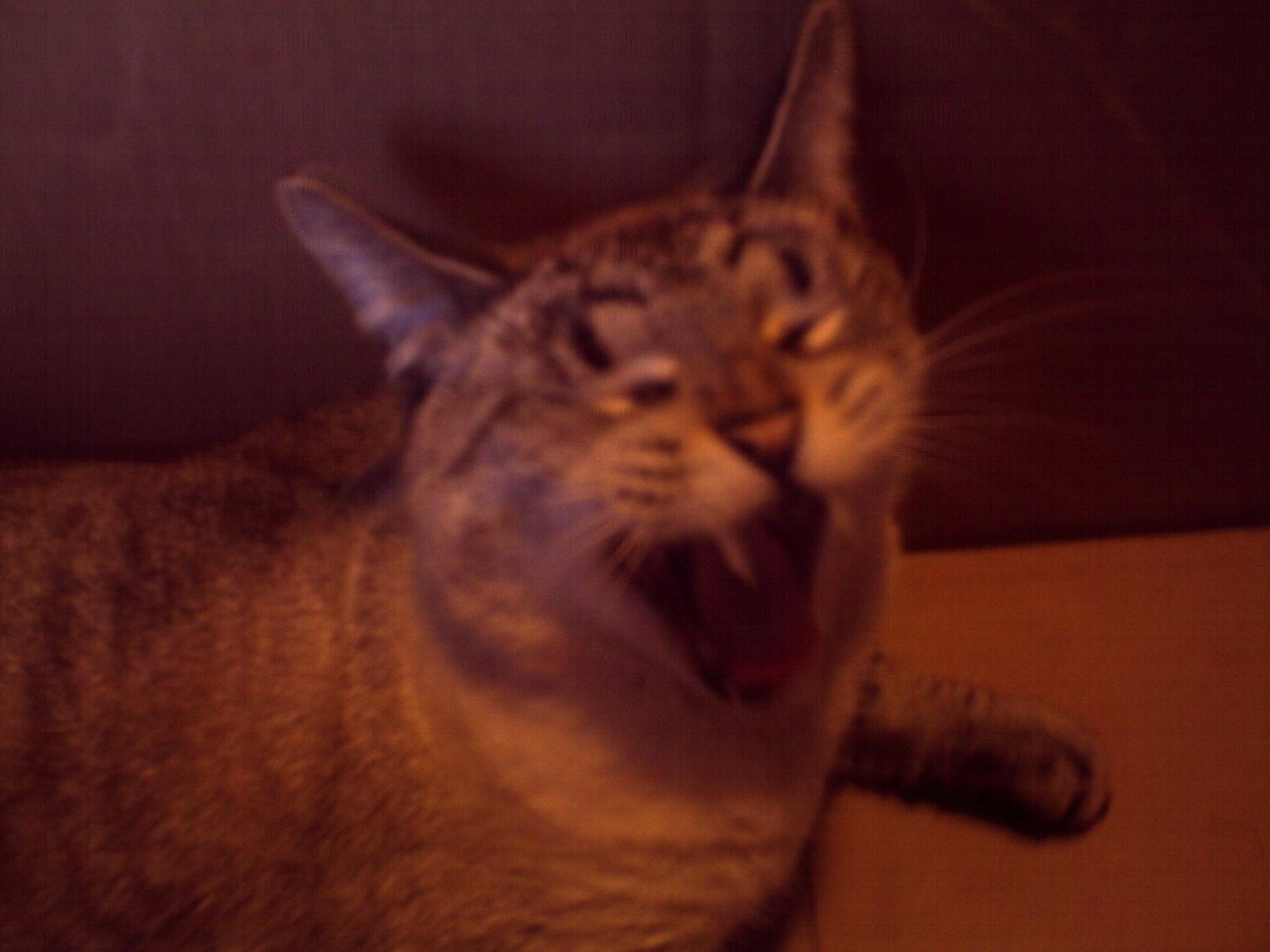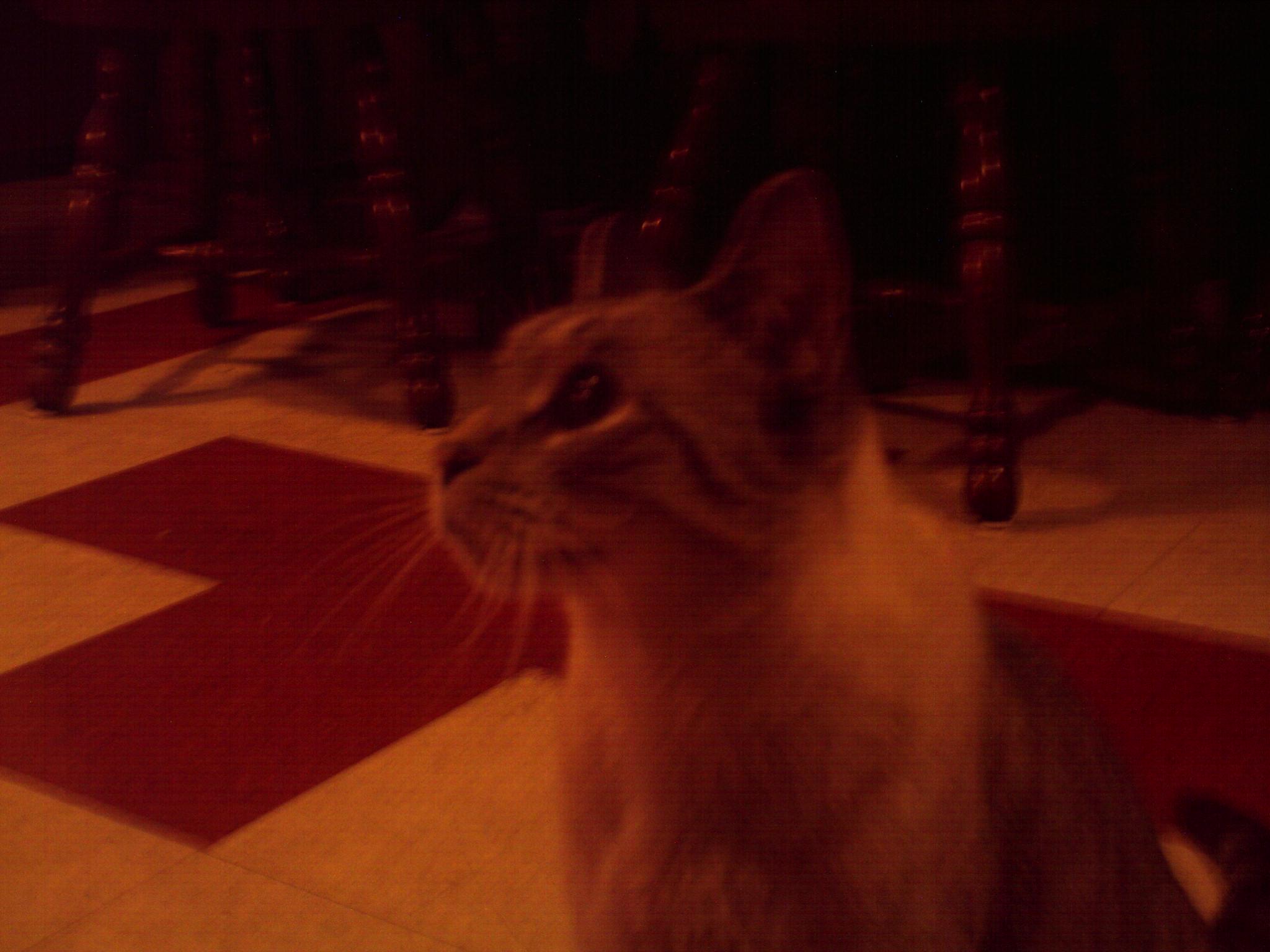 Today, I was a stinker. I grabbed ahold of mama's foot, about to attack and play with it, and it scared her and she kicked her foot, not knowing it was me. I flew through the air, And gosh, landed on the coffee table. Sheesh... peoplez. Then I climbed on top of the Television. It was fun. I'm 9 years old, by the way! well anyway, I scared Mama to death, she was trying to get me off of my tv. I clearly said no by jumping on her head, and she ran around the room screaming, Dexter!!! You scared the daylights out of me!!! Please get off my head!! and when she ran by the tv I jumped back on. She was stumped and left. Then she came back and I jumped off, onto the fish tank. It fell off it's table. Oops. Me almost kill fishy! Luckily, Mama ran and got the tank up. It had a lid and was plastic. Fred (the fish) was safe.... this time. But my fish snack won't get away next time. Now I took a nap..a long nap. From 11:00am until 12:00. now i'm hungry. I go eat some food, and see a couple bugs that came in here. How did they get on my territory? Oh yeah I forgot, that's Brandy and Mandy with their two new youngins, Goldberg & Bear. My mama has pet bugs, and releases them... and finds more. Hehe, every cat's killing all the bugs 'round here, so you seldom see'em. But they eat your cat food if they get loose from their tank! (which is ANOTHER plastic tank with a lid... in mama's room) So I had better finish'em off. Let's see... wait.... Let me pick them up! I scooped them up with the top of my paw and threw them in my water. He! So they go. Oh no! Here mama comes. I better hide the evidence I did it. I'll turn over my water bowl. Yup, there. Now she will thing an evil wind turned it over and the water drowned them. Oooh I better go take a nap. Bye bye!