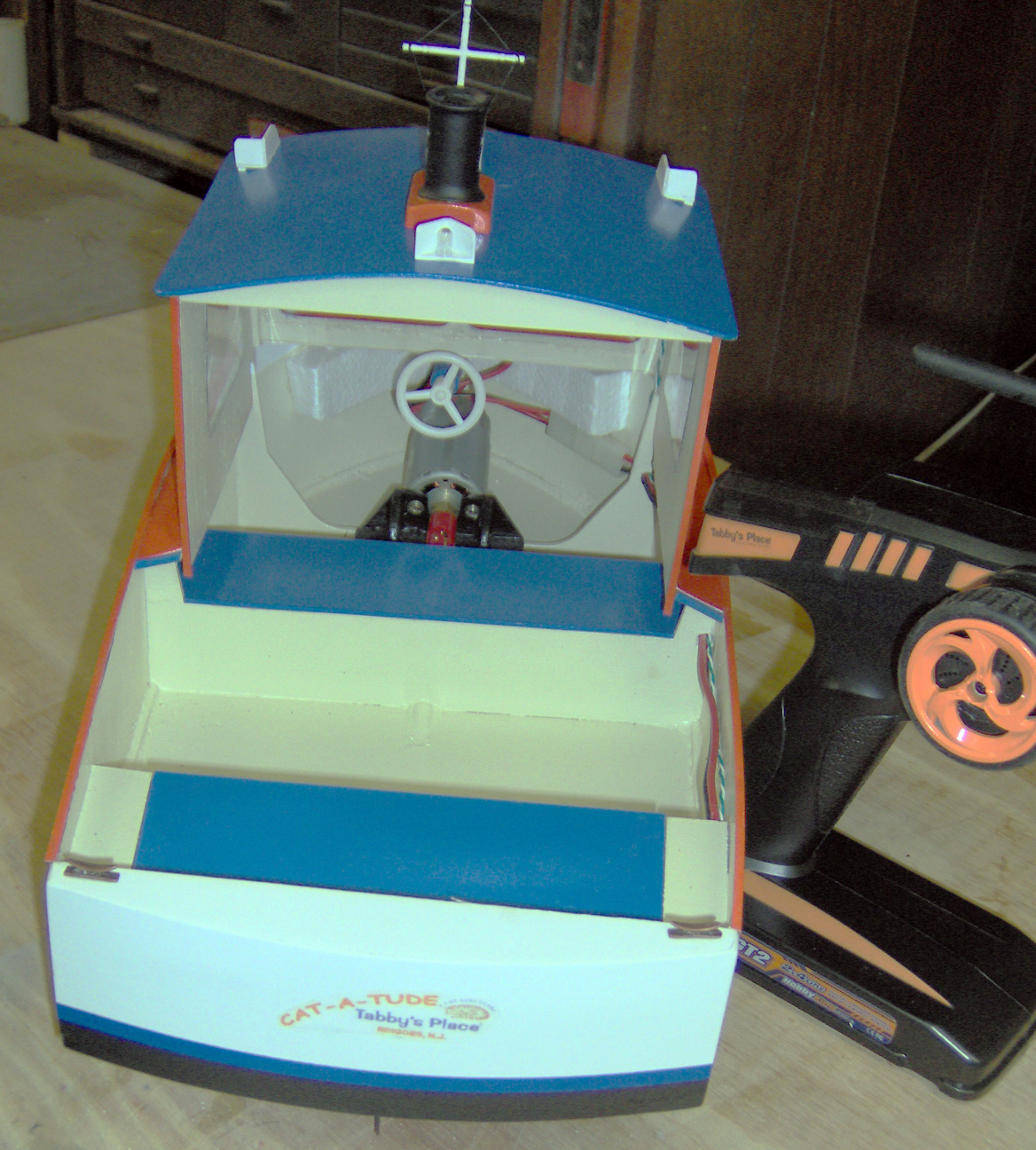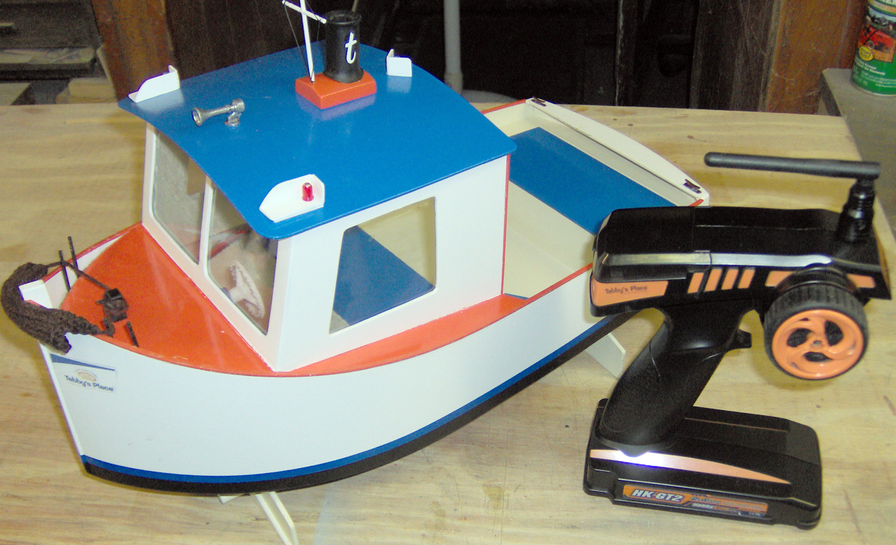 The model is designed and hand crafted by me. It includes the boat in Tabby's place colors (orange and blue), radio system, drive battery, charger and a custom wood carry/storage box.