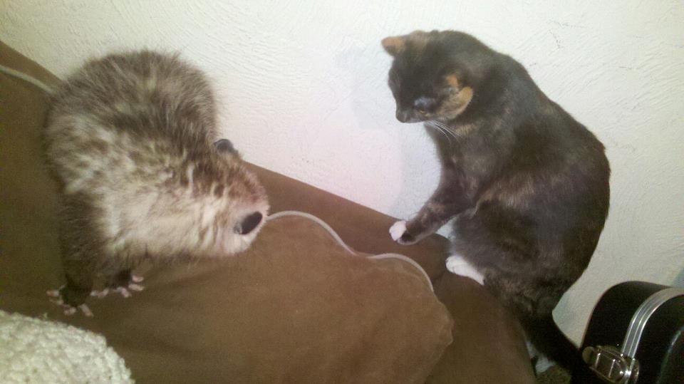 I say 6 and a half, as Gigi is not really mine. I just care for her so she doesn't starve.The possum and cats love eachother. They sleep together, eat together...tho the possum doesn't really play. His version of playing is climbing in and out of things.